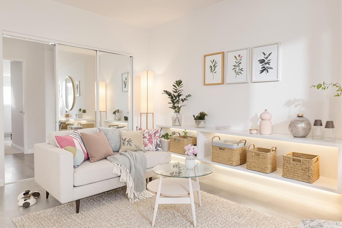 - Akzentlicht: Stelle eine Stehlampe neben das Sofa mit weichem Licht (2200–2700 K)